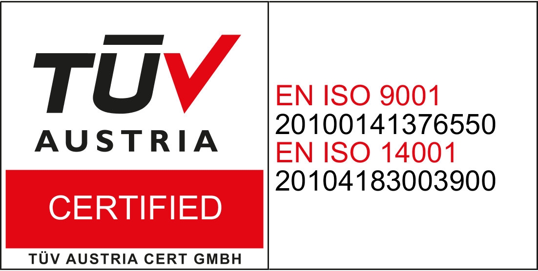 Kvaliteto naših storitev zagotavlja tudi certifikat TÜV AUSTRIA EN ISO 9001:2015 ter certifikat TÜV AUSTRIA EN ISO 14001:2015.